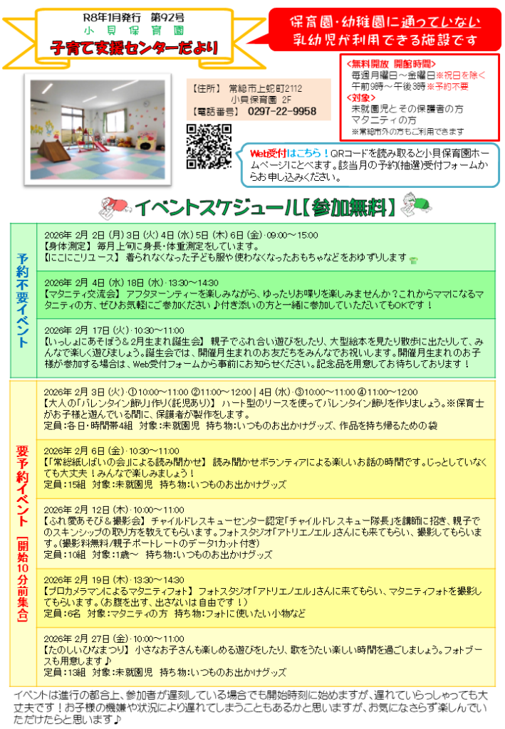 子育て支援センター令和8年2月のイベント予約(抽選)受付を開始いたします。
